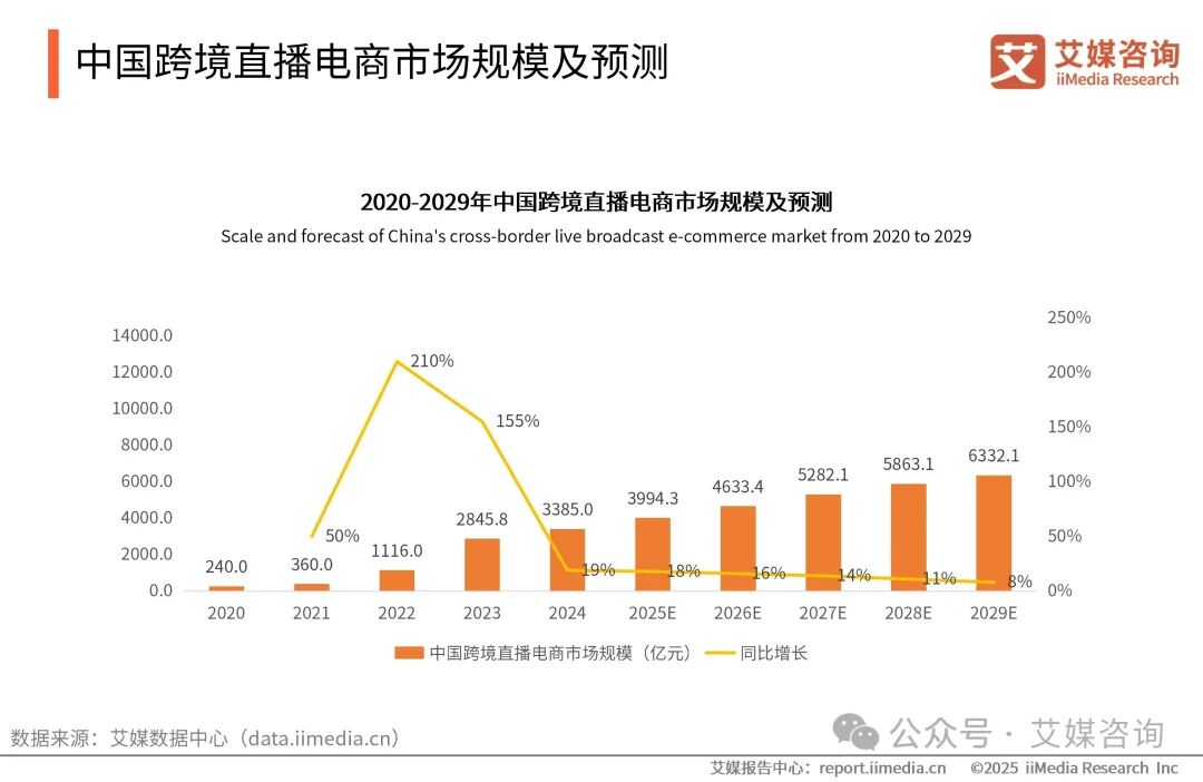 近年来,短视频作为全球流行的社交平台,其直播功能已成为跨境电商重要的带货渠道。据艾媒咨询数据显示,2020-2024年中国跨境直播电商的市场规模呈上升趋势,预计在2025年还会持续保持增长趋势,2029年市场规模将超过6000亿元。